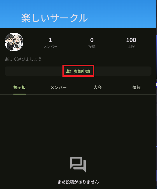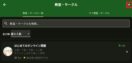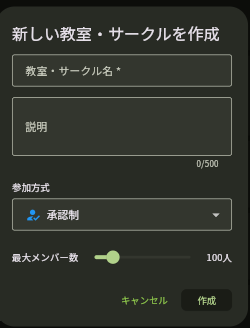 教室・サークル名と説明(←ここが重要)、参加方式(承認制・公開制・招待制)、最大人数を設定します。