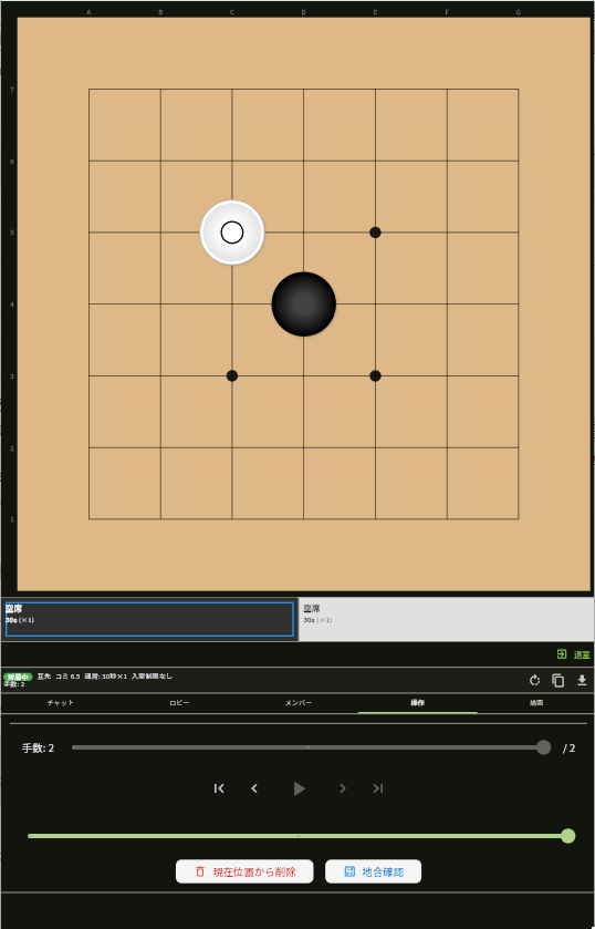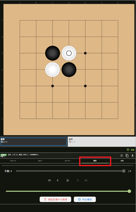 対局終了後、あるいは検討室を作成したら入室者全員が碁盤上に石をおいて検討できます。手を戻したりするのは操作タブを使ってください。
