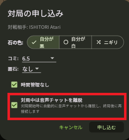対局を開始するときは対局者が音声チャットにとどまるか、離脱するかを選べます。