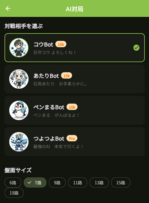 対局相手のAIを選んで対局条件を決めて対局開始してください。