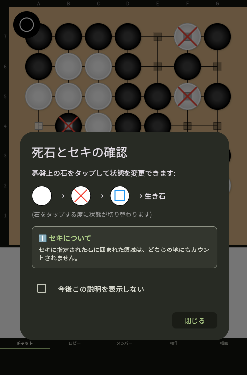 死石・セキはいちおう自動判定されますが、セキや大きな死石については誤判定も発生しますので目視で変更してください。該当石をクリックするたびにその石のグループが生き石→死石→セキ石と変わります。セキ石に囲まれた空間は地にカウントされなくなります。